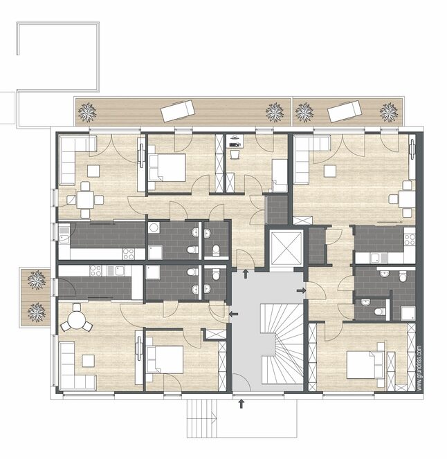 Die Wohnungen verteilen sich auf Erdgeschoss, Obergeschosse und Dachgeschoss. Unterschiedliche Lagen im Haus ermöglichen eine Auswahl je nach Wunsch nach Gartenbezug, Balkon oder ruhiger Lage innerhalb des Gebäudes.